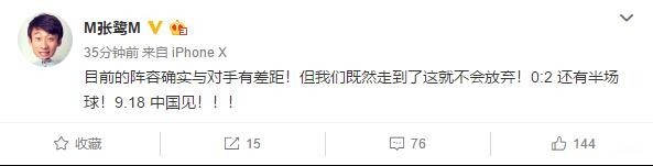 虽然境况不佳,但张鹭依然没有放弃,他坦言球队目前阵容实力有差距并激励球队写道:“目前的阵容确实与对手有差距!但我们既然走到了这就不会放弃!0-2,还有半场球!9.18,中国见!!!”