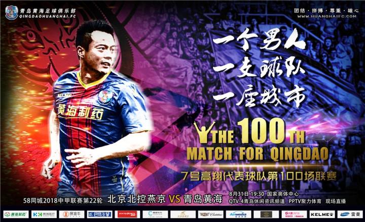 2018年8月31日晚上19点30分,青岛黄海足球队客场挑战北京北控燕京足球队,见证高翔代表球队的第100场联赛!