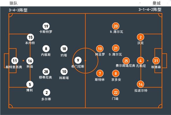 本场比赛狼队采用3-4-3阵型,曼城采用3-1-4-2阵型应对,在防守上他们的阵型会略有不同,我们在下边会介绍。