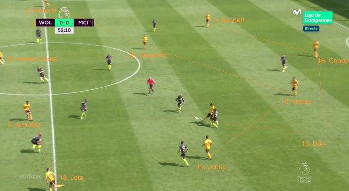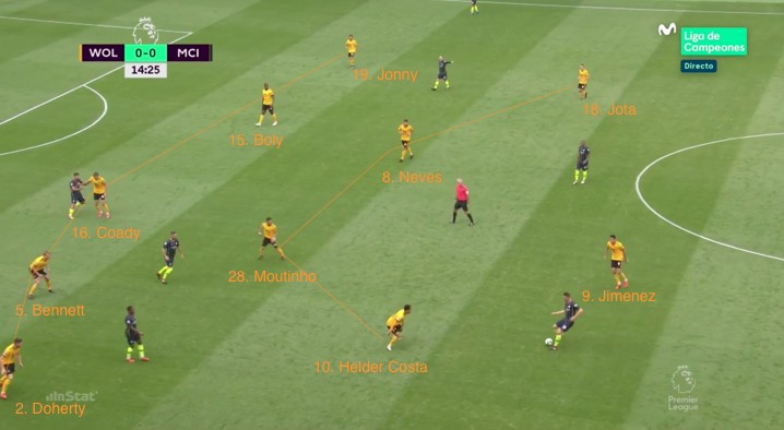 无球时,狼队以5-4-1阵型在中场发起拦截,边路的卡斯特罗和多尔蒂还有三名中后卫组成最后一道防线,约塔和科斯塔在前面组成第一道防线,中间由内维斯和穆蒂尼奥阻截曼城向前的直塞球。