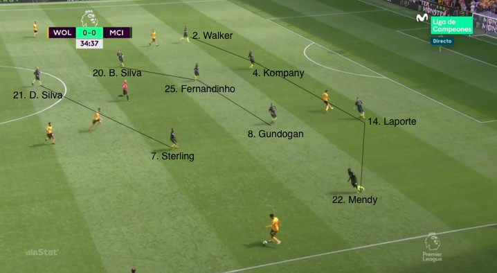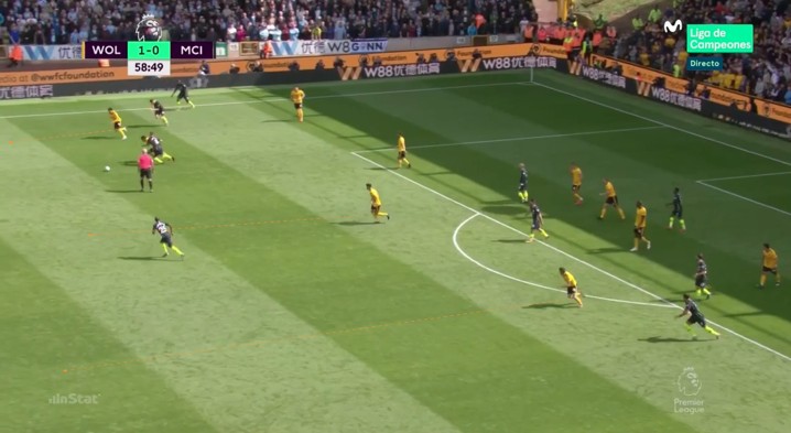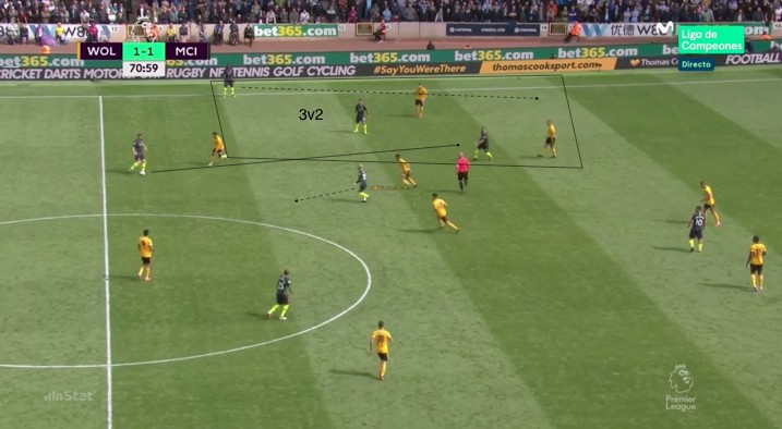 曼城主要攻击狼队的右路,拉波尔特经常将球输送出来后,在进入到这一侧的中场,这这里,大卫.席尔瓦将内维斯带出位置,开辟一条向前直塞给京多安的传球通道,然后京多安、斯特林(热苏斯)和门迪在局部形成3V2的人数优势,将狼队的防守重心拉出来,创造一个突破的空间,上半场,这样的机会出现过几次,但是曼城都没有把握住。