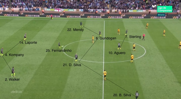 曼城的控球结构非常流畅,在3-1-4-2阵型中,费尔南迪尼奥在后腰位置提供中转,门迪和B席在两边拉开宽度,京多安和大卫.席尔瓦主要在狼队的后防线和中场线间活动,阿圭罗和斯特林负责将对方的后防线顶住,并同时适当回撤拿球。
