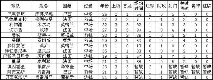 (图)欧洲主要联赛部分7号数据一览