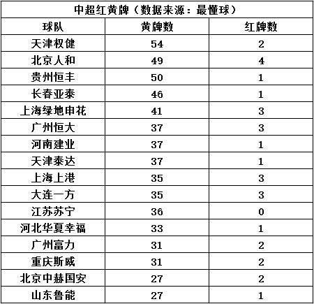 另外,在红牌数方面,北京人和以4张红牌居首,上海绿地申花、广州恒大、大连一方和上海上港都拿到了3张红牌,值得一提的是,江苏苏宁在本赛季联赛中还未得到过红牌。