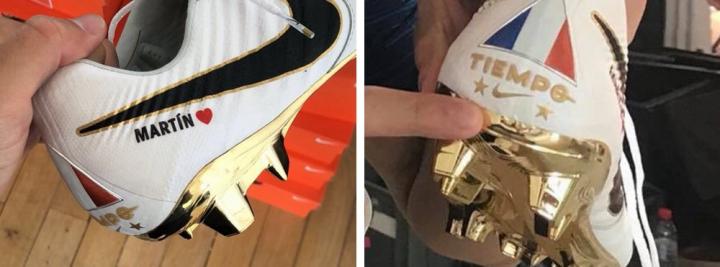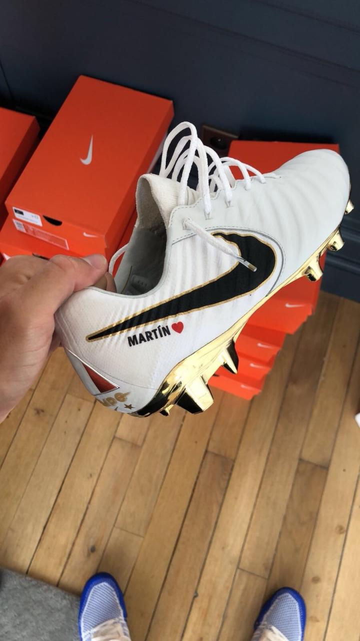此外,球鞋后跟上不仅加入法国国旗,“Tiempo”与Nike Swoosh也采用金色设计,同时加入两颗象征世界杯冠军的金色五角星,展现了卢卡斯·埃尔南德斯作为2018世界杯冠军队成员的荣耀时刻。同时,鞋身上还加入带有爱心的“Martin ”字样,这是这位法国国脚刚刚出生的儿子的名字。