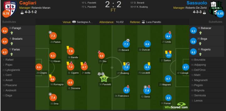 说到评分我们可以注意到whoscored给出的评分萨索洛全队的均分要远远低于卡利亚里,我认为这确实也是比较客观的。萨索洛在比赛最后时刻靠点球扳平有一定运气成分,无论是从创造机会的次数和场面来看,卡利亚里都占据着上风。差距之所以这么大或许是考虑到双方近期的状态赛前大家都一致看好萨索洛却失望而归导致的吧。还记得上一期复盘时,我说过本赛季对阵实力差距不大的对手时会踢出什么样的表现或许比与强队之间的较量更为重要。本场比赛面对卡利亚里,一下子就暴露出了很多问题,本次复盘就主要来谈谈问题所在和以后的展望。