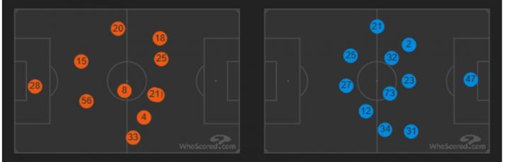 我们首先就先来关注小洛卡在萨索洛首秀的表现。whoscored给他打出了6.5分的全队均分。的确他在本场比赛并不是特别得活跃。我们知道洛卡特利与马尼亚内利是两种风格不同的拖后中场,马尼亚内利是标准的防守型中场,上一场比赛的分析中我们看到了他在球队进攻时基本不上前,防守时甚至退回禁区内帮助中卫协防,而洛卡特利是所谓的组织型后腰,本场比赛他有81次的触球,比马尼亚内利上一场多出了16次。他也在开场阶段送出了一次关键直塞与几次向左右两边的调度。但反观防守端的表现,上一场面对国际米兰的围攻,马尼亚内利贡献了3次铲断和3次拦截,还有5次解围,而本场小洛卡只有2次拦截,铲断和解围数都是0,考虑到对手的进攻压力不同,这些数据并不是特别有可比性。但不可否认的是,洛卡特利在本场防守端的表现并不是特别出彩,也许是因为卡利亚里这支队伍较弱,德泽尔比派洛卡特利登场就是为了加强进攻,但比赛的后半部分,随着体能的下降,他在进攻端也没什么特别的贡献了,所以我认为6.5的评分,不能说打低了。面对卡利亚里这样实力相当的球队,或许上洛卡特利以一个积极的姿态去比赛的想法并没有太大问题,但他还需要与球队更加的磨合。从跑动的热点图来看,小洛卡不能说不积极,中场的覆盖度是符合拖后中场的要求的,但是他与邓肯在中场的搭档,二人对于谁回撤接应谁前插助攻的分工较为模糊,这也许也是赛后二人双双未得到高分的原因吧。