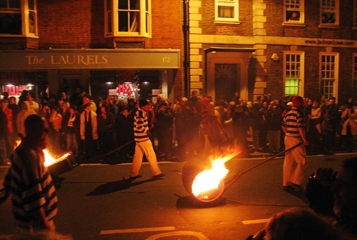在苏塞克斯郡,有着大大小小几十个篝火协会,不同的协会在篝火节当中有着不同的庆祝方式。比如上面这个图里面的克里夫篝火协会,协会的成员喜欢在篝火节中拖着燃烧的汽油桶参与游行。