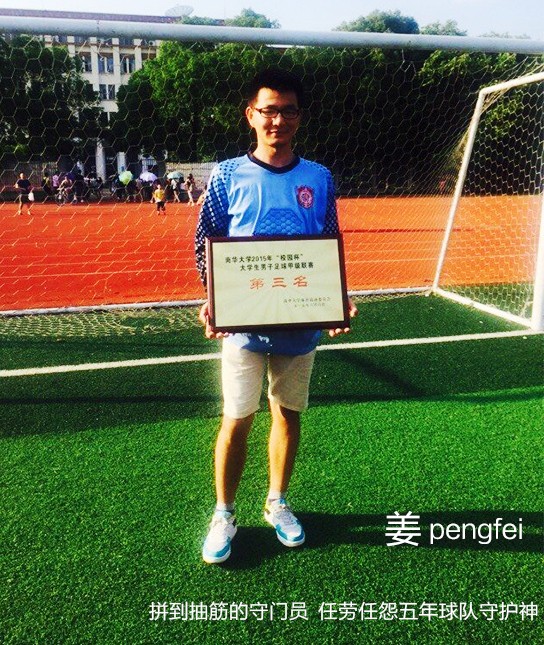 鹏飞:大学五年最难忘的一段经历就是在院足球队和小伙伴一起愉快的踢球了。说起进入院队还挺巧合的,当时一帮室友在市区逛,经过体育用品店,在海源的带动下,几个人买了球鞋跟球衣,回去在新校区的杂草丛生的球场玩,刚好学长过来招新员。以前没踢过球,学长还是让我进入球队,基础计较薄弱,后来就专练守门员了。