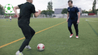二、第二个动作是挑球过人动作,这个动作需要非惯用脚向惯用脚的一侧拉球,要使足球有一定的速度,这让在挑球时会更加的容易,当防守队员向你拉球的方向靠近时,快速将球挑起完成过人动作。