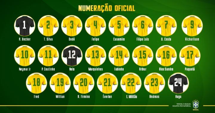 巴西国家队公布球衣号码:8号暂空缺,里沙利松9号