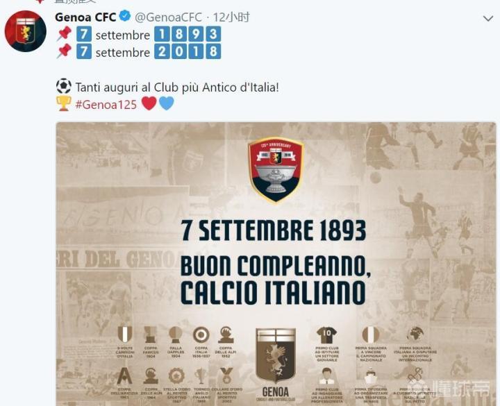 热那亚在官推上发文表示:“意大利最古老的俱乐部生日快乐!”