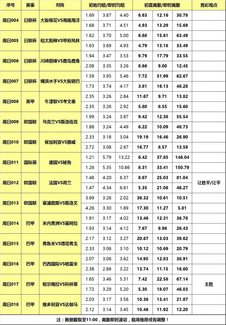 周日足坛赛事丰富,下午日联杯1/4决赛进入第二场争夺,日乙余下3场联赛同时进行;晚间FIFA欧洲国家队赛事赛事丰富,法国主场迎战荷兰,另外德国热身赛对阵秘鲁,周一凌晨巴甲6场较量。周日竞彩共计开售19场,早间档精选分享日联杯和FIFA赛事等15场指数,另附FIFA欧洲国家联赛和巴甲2场早场解读!