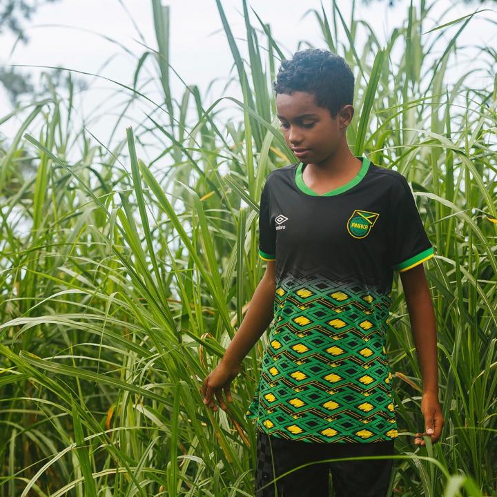 umbro为牙买加国家队设计的全新客场球衣拥有令人印象深刻的外观,低调的黑色球衣上加入引人注目的绿色与金黄色格纹图案,展现了这个加勒比岛国独特的流行风格与充满活力的独特文化。