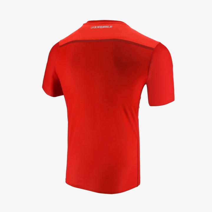 球衣胸前的绶带条纹中加入热压印工艺打造的秘鲁足协徽章,简约的V领上加入白色条纹,形成红白两色的秘鲁国旗形象。背后衣领下方加入秘鲁国家队的绰号“La Blanquirroja”(白红军团)。