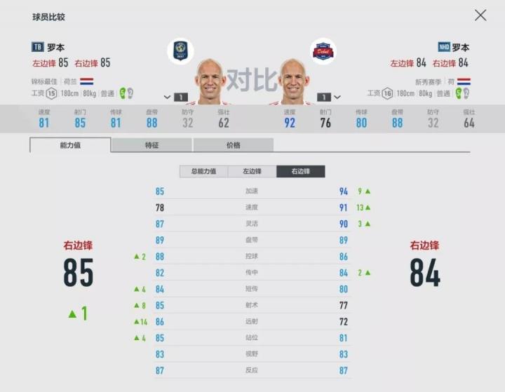 提到罗老汉,人们都会想起他飞快的速度和标志性的右边路内切射门,为什么是右边路内切?因为他的右脚只能当支撑脚。游戏中的TB赛季和NHD两张罗本都是52脚,都有88的盘带,不用担心在边路突破时像有些小妖一样,趟出去就没有然后了。NHD的罗本速度更快,双速突破90,但是射门数值就有点欠缺了,完美契合他刚出道时的踢法,突破犀利。而TB罗本就均衡很多了,经过岁月洗礼的罗老汉射术更加精湛,但是速度下降了,然而加速还能达到85,用来最后一下变速甩开防守球员绰绰有余,并且内切射门更具威胁。两款老汉,你喜欢哪一款?