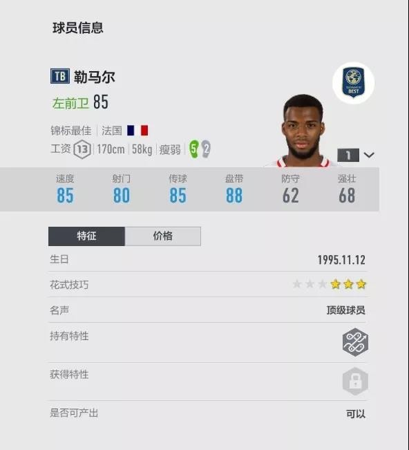 作为马竞队史上最贵的引援,这位95年出生的小将自然吸引了无数的关注,勒马尔在马德里的未来值得期待。这张TB勒马尔的进攻属性非常均衡,带球过人传球射门一条龙操作。在左边路的带球那时相当的顺滑,非要在鸡蛋里挑骨头的话,就是他的花式并不出色,难以玩出骚操作。小编建议把他放在左边路,因为他是52天残脚,他出色的传中技术放在右边路就有点暴殄天物了,在边路还能减少直接的身体对抗,一脚传中,中路包抄,对手的防守只能靠门将的玄学了~