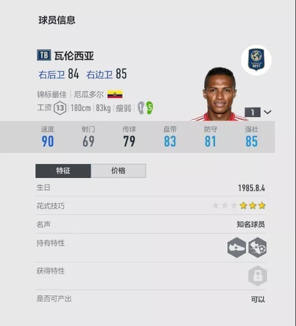曼联社交媒体健身一哥瓦伦西亚,年过三旬还能保持这么出色的身体状态跟他的自律和刻苦训练是分不开的,从边锋改打边卫的他依然稳坐着曼联右边的主力。游戏中的他天残脚可谓到了一种极致,但是这并不代表他不是一个好的边卫。在边后卫的位置上,速度、模型、防守和强壮是最需要考虑的因素。大瓦伦180cm/83kg的标准边卫模型加上90的速度,怎么看怎么舒服,强壮和防守也不差,不怕对方边路球员的冲击。传中也有87,在右边路插上传一脚,中锋一锤定音,粗暴高效!