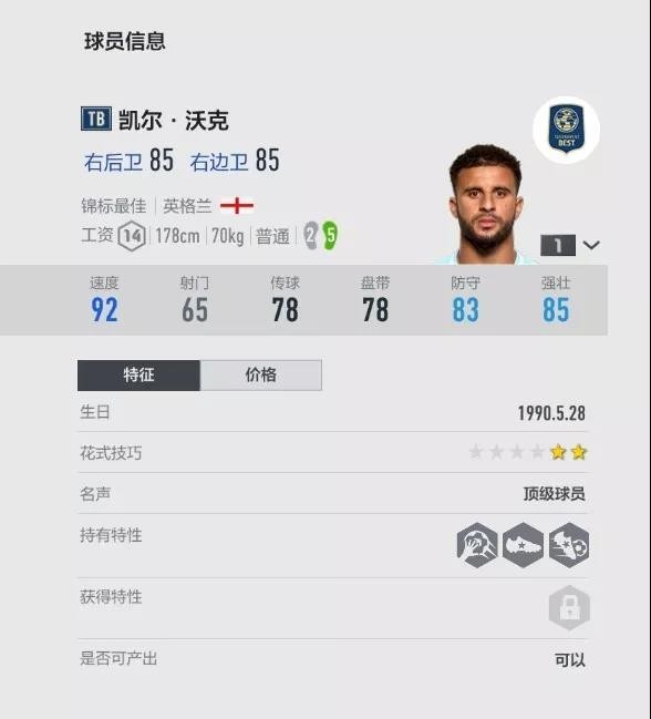 曼城边卫凯尔·沃克跟随球队度过了一个美妙的赛季,他的精彩表现也让他身价飞涨,成为了世界上最炙手可热的边卫之一。他在FIFA ONLINE 4的游戏里也是出镜率最高的右边后卫之一,跟瓦伦西亚一样,沃克也是一个天残脚。但他拥有出色的速度和强壮数值,在边路能应付大多数的边路进攻球员。虽然他的盘带和传中不如大瓦伦,但是他有“长传直塞”的特性,能在后场直接发起反击,是球队进攻的一大利器。喜欢打长传反击的玩家一定要入手试一试!