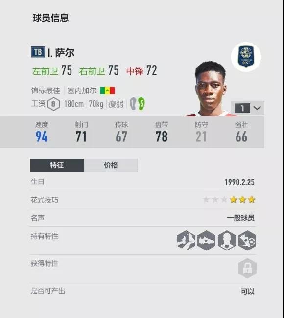 这位98年出生的小妖现在效力于法甲的雷恩俱乐部,并且跟随塞内加尔国家队参加了今年的世界杯。虽然这个球员综评并不出色,但是94的速度值已经够抓人眼球了,高强之后更是恐怖。小编亲测,这张卡的ZD和跑位十分的风骚。他搓射打出的弧线极其诡异,经常会出乎对方防守的意料。他在中锋位置上的跑位不仅让对手头疼,也会出乎你自己的意料,你还不知道发生了什么,那个球就跑到他脚下了。谁说15脚只能踢边后卫,这位玄学前锋了解一下?