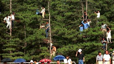 (图)延吉体育场可容纳3万观众,可仍有不少球迷只能挂树观赛
