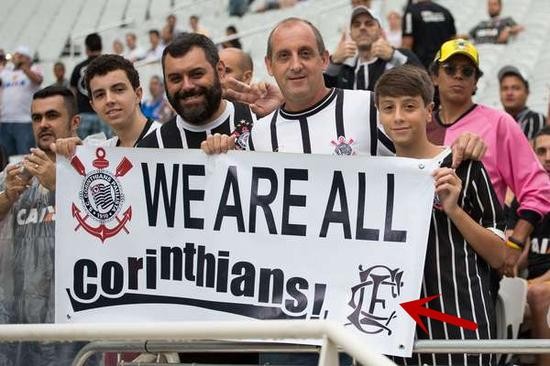 (图)巴西科林蒂安球迷,至今感激百年前英国那支科林蒂安队,右下角为英国科林蒂安队标