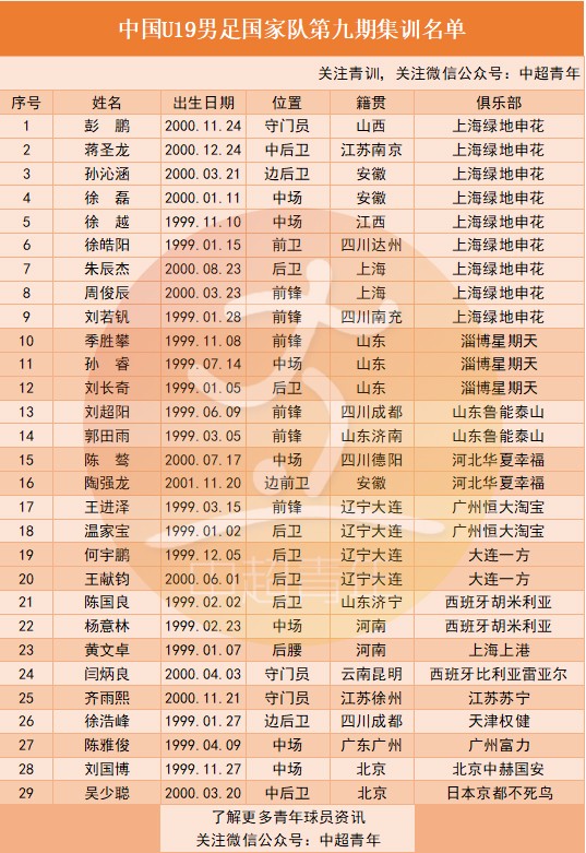 四、U19国青赴印尼集训名单出炉:申花9人。
