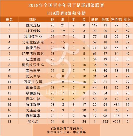 U19青超联赛B组积分榜: