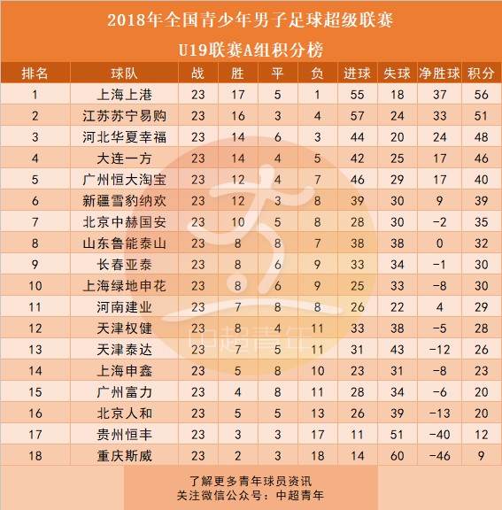 U19青超联赛A组积分榜: