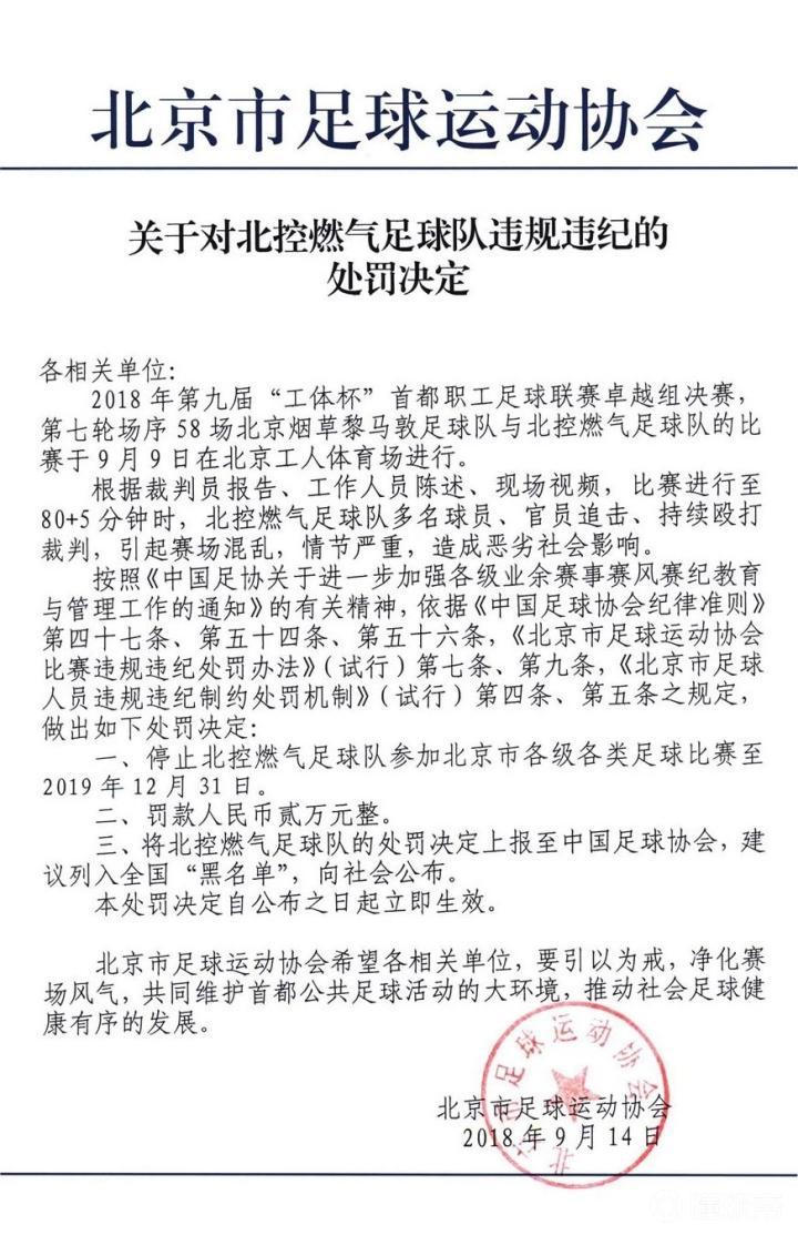 北京时间9月14日,北京市足协官方发布了对北控燃气足球队及球队助理教练徐勇旻、队员杨泉、李俊、刘巩、张翊镔的处罚通知。因追击并持续殴打裁判员,北控燃气足球队遭禁赛一年,球队五人获终身禁足处罚。