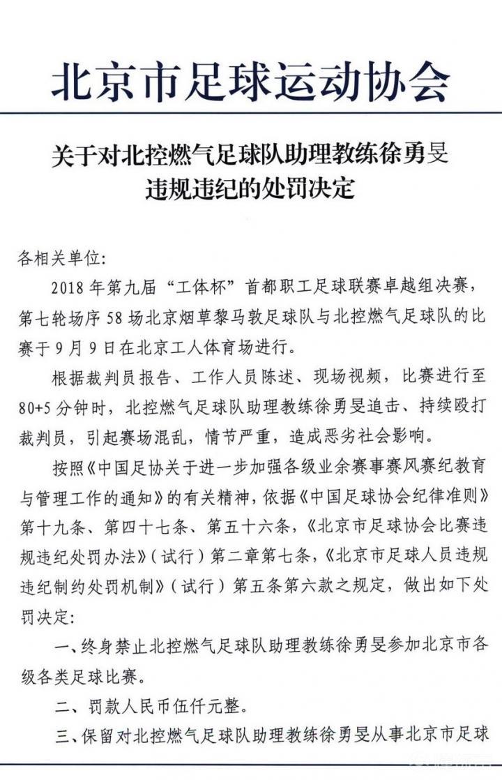 一、终身禁止北控燃气足球队助理教练徐勇旻参加北京市各级各类足球比赛。