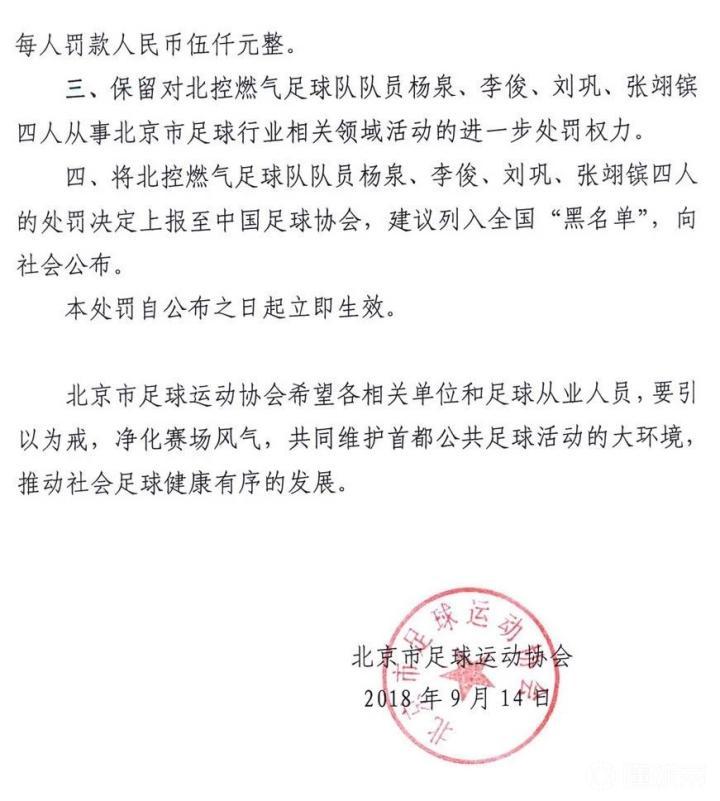 四、将北控燃气足球队队员杨泉、李俊、刘巩、张翊镔四人的处罚决定上报至中国足球协会,建议列入全国“黑名单”,向社会公布。