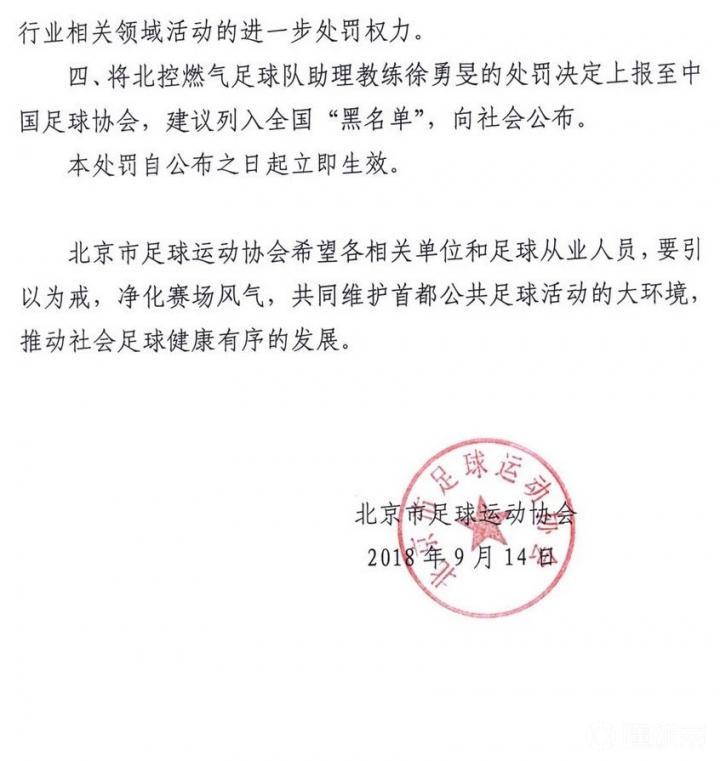四、将北控燃气足球队助理教练徐勇旻的处罚决定上报至中国足球协会,建议列入全国“黑名单”,向社会公布。