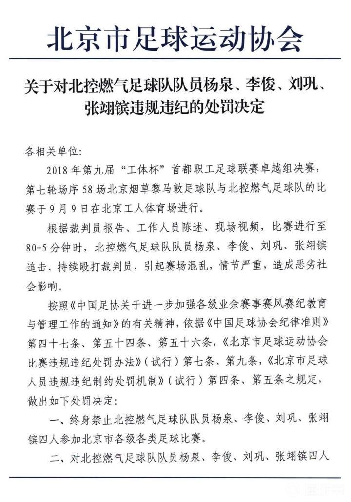 一、终身禁止北控燃气足球队队员杨泉、李俊、刘巩、张翊镔四人参加北京市各级各类足球比赛。