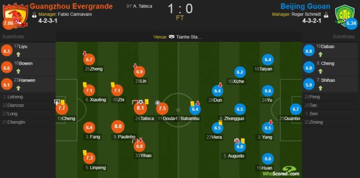 恒大方面,打入绝杀进球的塔利斯卡获得了全场最高的8.1分!国安方面,发挥出色多次救险的郭全博获得了全队最高的6.7分。