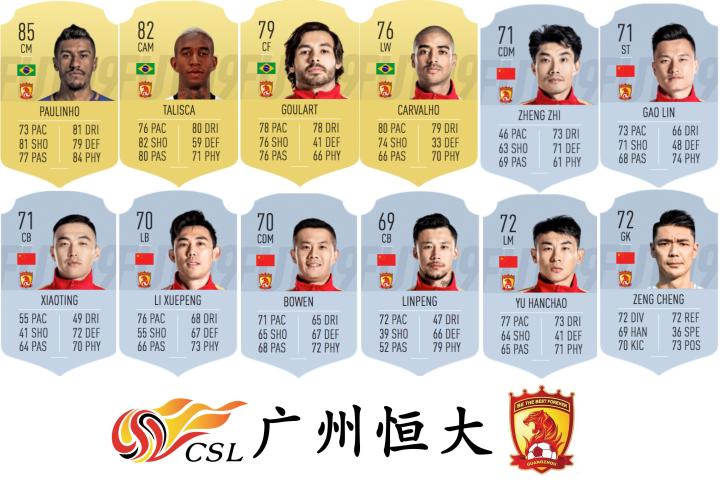 广州恒大由4名金卡球员:保利尼奥,塔利斯卡,高拉特,阿兰组成。