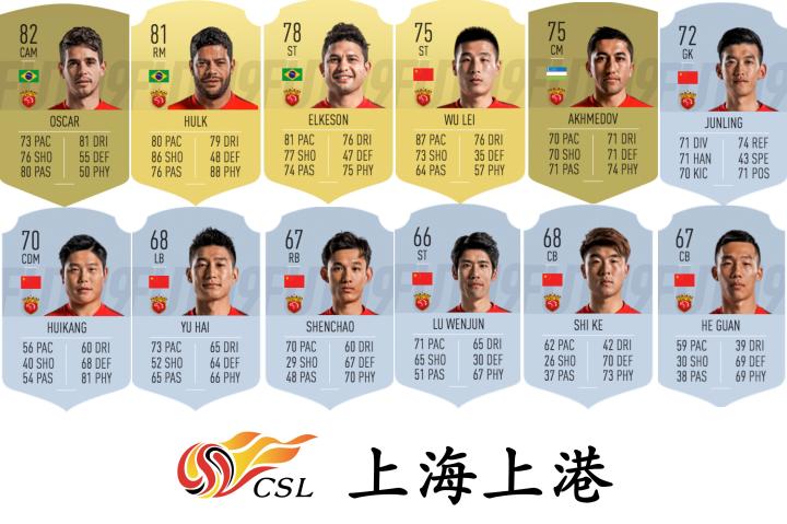 上海上港由5名金卡球员:奥斯卡,浩克,埃尔克森,武磊,艾哈迈多夫组成。其中武磊成为中国球员中的唯一闪金卡。