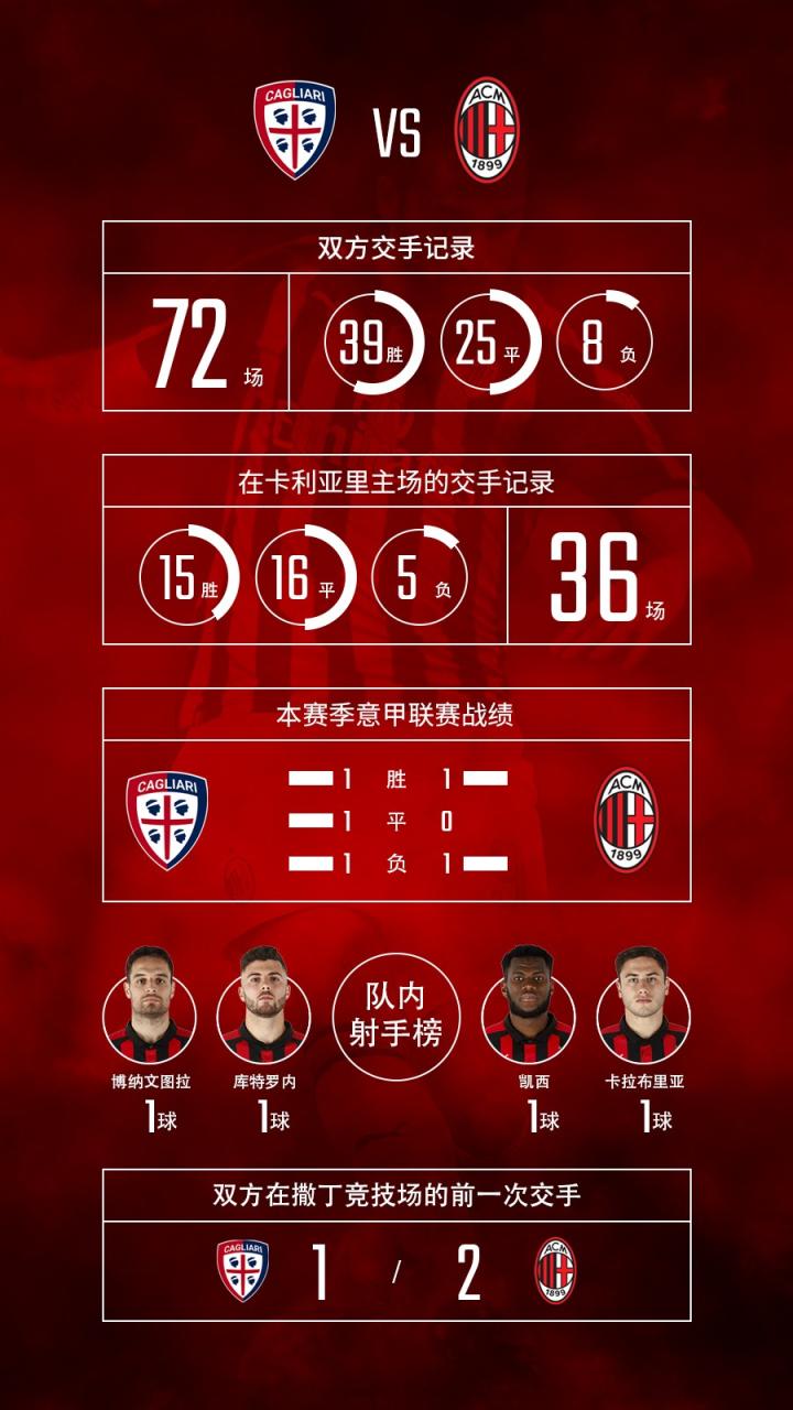 这将是双方在意甲联赛的第73次交手,同时也是米兰第37次造访卡利亚里主场。两队先前的交手记录中,米兰以39胜占据了绝对的优势。红黑军团也在远征撒丁岛的36场比赛中,取得了15胜16平5负的好成绩。