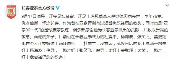 长春亚泰足球俱乐部官方微博写道:9月17日清晨,辽宁足坛名宿、辽足十连冠奠基人倪继德因病去世,享年76岁。