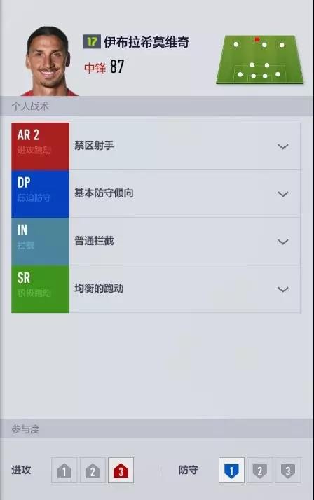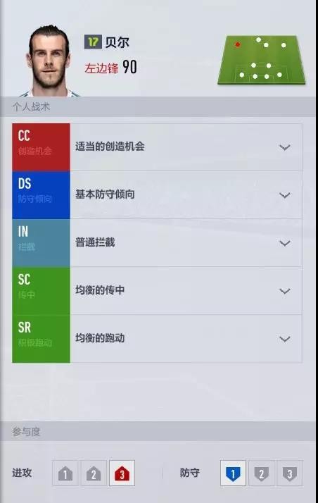 可设定选项包括进攻跑动、压迫防守、拦击、积极跑动四项个人战术,还有个人的进攻、防守参与度。参与度小编就不再过多赘述,前锋球员攻3守1是基本操作,接下来我会详细分析每个个人战术选项。