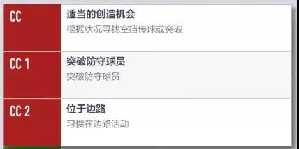 设定CC1,边路球员的心中会出现一个字——过,球员的跑位方式会更倾向于突破防守向球门方向冲击;而在CC2的设定之下,球员很多时候会在边路进行接应、配合,直接发起进攻的倾向性不强。