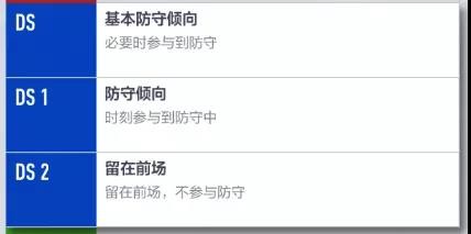 人们常常夸赞好的边路球员“通吃一条边”,虽然说得更多是边后卫,但是边锋依然可以开始承载边路防守的任务,尤其是贝尔这样边后卫出身的边锋,不参与防守简直可惜!DS1就是更鼓励球员参与到防守之中,而DS2则是不防守,大家可以根据自己的阵型和球员特性酌情选择。