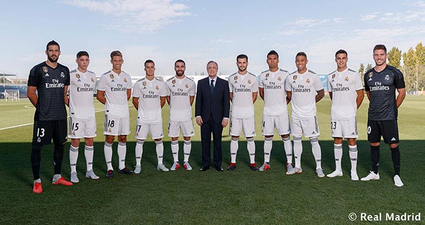 皇马近日拍摄了18/19赛季一线队的全家福,除了25名球员及主帅洛佩特吉外,合影中还包括主席弗洛伦蒂诺和名誉主席帕科-亨托。
