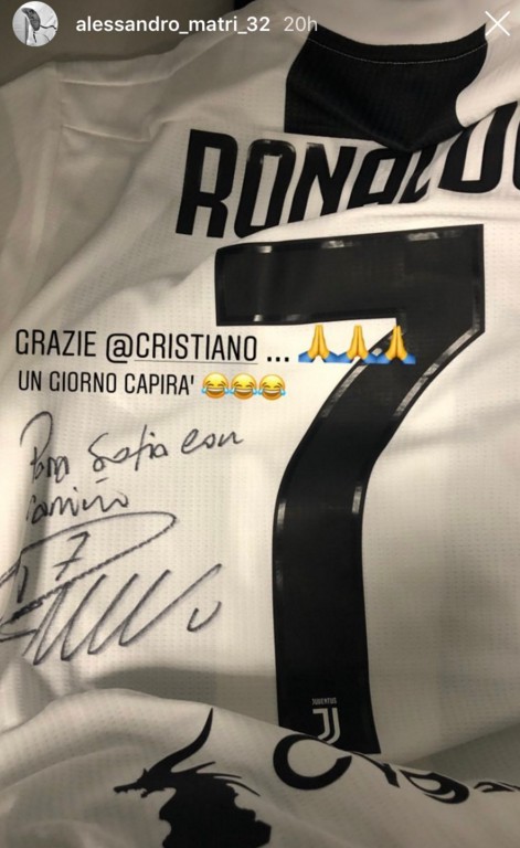 昨天,马特里在Instagram中贴出了C罗签名球衣的照片,表示这件球衣是C罗送给宝贝女儿索菲娅的礼物。同时,马特里这样写道:“谢谢你,C罗,总有一天她(索菲娅)会明白这件礼物是多么珍贵。”