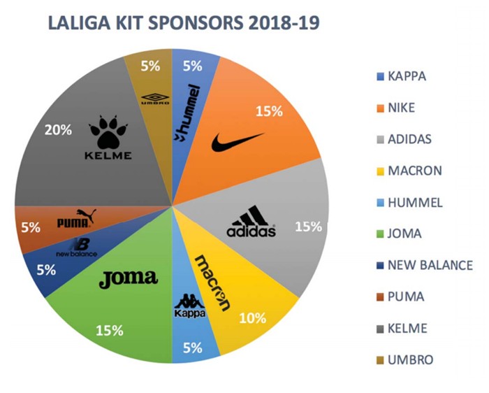 2018-2019赛季,在装备制造商方面,20支西甲球队分别由10家不同的公司赞助。从数量上看,卡尔美是最大赢家,他们总共赞助了4支球队。而耐克、阿迪达斯和Joma都分别赞助了三只球队,数量上并列第二。