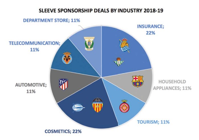 2018-2019赛季,有9支西甲球队找到了袖标广告的赞助商。而这些赞助商涉及的领域都大不相同,包括保险、家用电器、旅游、化妆品、汽车、电讯和百货商店。从数量上看,保险和化妆品公司并列第一,分别赞助了两支球队。