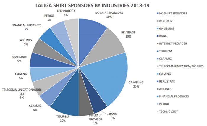 2018-2019赛季,西甲各支球队球衣广告赞助商涉及的领域同样有很大差异。除了两支没有球衣广告赞助商的球队之外,另外18支球队的球衣广告被13个不同领域的公司瓜分,包括饮料、博彩、银行、互联网供应商、旅游、陶器、电讯、游戏、房地产、航空、金融产品、汽油和科技。这其中,赞助球队最多的是博彩公司,他们赞助了4支球队。
