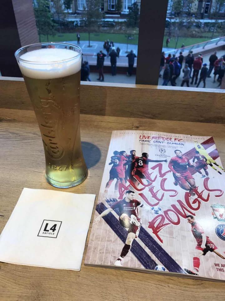 于是,假期选在了利物浦比赛最密集的两周时间,有欧战、联赛、联赛杯可以随便挑。不过在利物浦小手一抖抽到大巴黎之后,这场欧冠小组赛便成了最优选择。之后的行程并不顺利,签证在出发前一周还没下,等来了签证又迟迟订不到球票,搞到票了利物浦官方又告知因为准备欧战,球场参观不包含更衣室和虎摸“This is Anfield”。一时间心灰意冷——这趟朝圣之旅已经搞得像是九九八十一难,如果再摸不到那块牌子就像到了大雷音寺也没能取到真经一般。