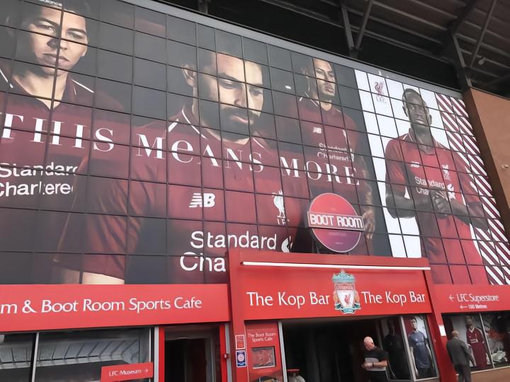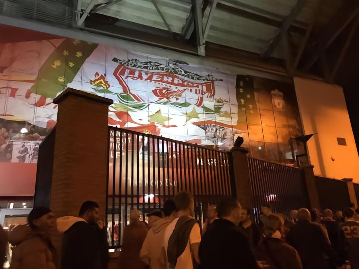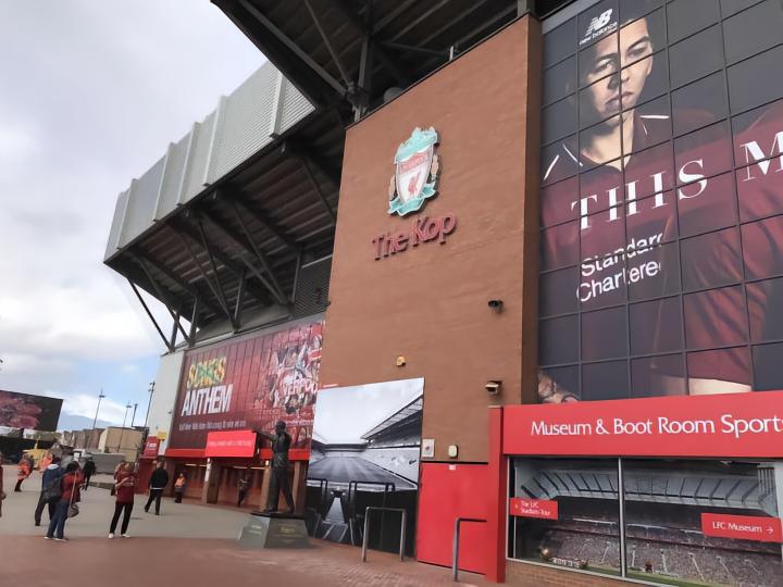 还好,安菲尔德作为利村地标型建筑之一,设有着自己单独的站点,在巴士司机的一通飘移过后,球场就这么直楞楞的出现在眼前。