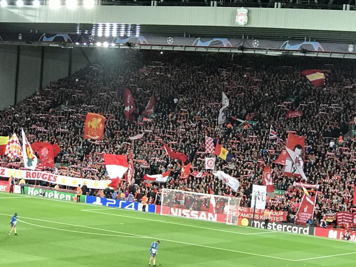 终于,到了进场的时间。进场之时,巴黎球迷已经占据了球场一个角球区,并用歌声淹没了球场的其他部分。是的,在以歌声嘹亮著称的安菲尔德,首先撒欢的却是大巴黎球迷。他们训练有素整齐划一,助威声震慑夜空,甚至在阴冷潮湿还下着大雨的球场上赤膊上阵,简直把支持球队搞成某种宗教。这种宗教在内马尔、姆巴佩等球员出场热身时达到了顶峰,一瞬间我耳朵嗡鸣,不知道自己是在安菲尔德还是王子公园。